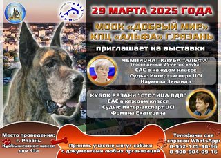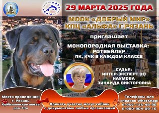 Отправлено: 11.12.24 13:56. Заголовок: 29.03.2025 г. "Кубок Рязани-Столица ВДВ", "Чемпионат клуба Альфа"+ моно ротвейлер