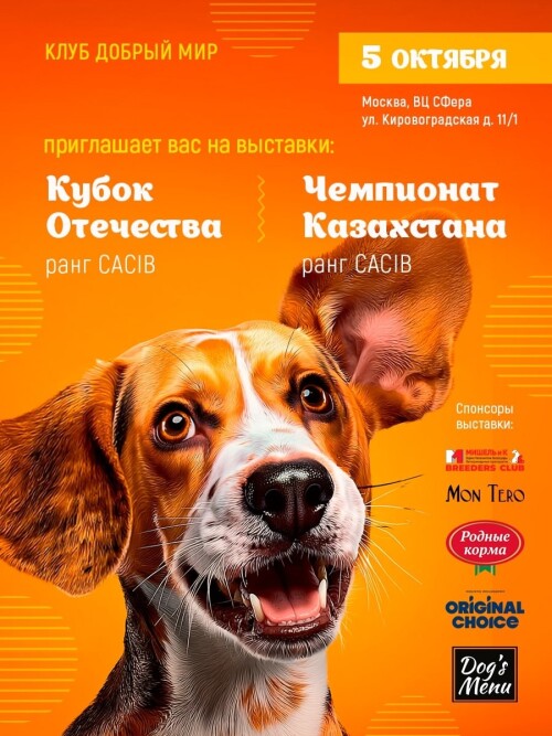 05.10.2025 г. МООК "Добрый мир" приглашает на выставки: "Кубок Отечества"-ранг САCIB "Чемпионат Казахстана"-ранг САCIB Фестиваль собак компаньонов МОНОпородная выставка ТАКСА ранг Чемпион клуба тел. офиса (499)393-31-61, 8-925-422-43-51, 8-926-810-90-90 эл. почта sid8850@ya.ru В рамках выставок будут проводиться конкурсы, в которых могут участвовать собаки экспонировавшиеся на данных выставках, заранее записанные. Записаться на конкурсы можно на выставке. Все конкурсы проводятся по окончанию экстерьерных рингов. Запись на конкурсы бесплатная. 1. Конкурс "Ребенок и собака" (дети до 12 лет) 2. "Гордость России" (ЛПП, только для отечественных пород) 3. "Гордость Доброго Мира (для собак с родословной Доброго Мира, имеющих титулы: Интер-Чемпион, Абсолютный Чемпион") 4. Конкурс питомников (участвуют от 3 до 5 собаки одной породы, рожденные в одном питомнике, имеющие одну заводскую приставку) 5. Конкурс пар (участвуют 2 собаки одной породы кобель и сука, принадлежащие одному владельцу. Пару выставляет один хэндлер.) 6. Конкурс производителей (участвуют производитель или производительница и от 3 до 5 потомков) 7. Конкурс костюмов